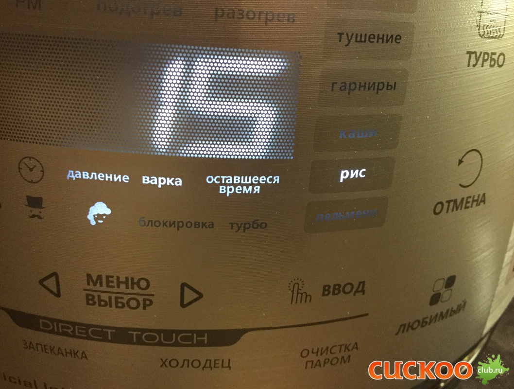 еще раз проверить на соль и включить режим "рис" , ( подпрограмма 1) программа автоматическая, работает на выпаривание воды,ждём ....,сначала бегает змейка, потом через минут 6-7, на табло высветилось время..ждём ....