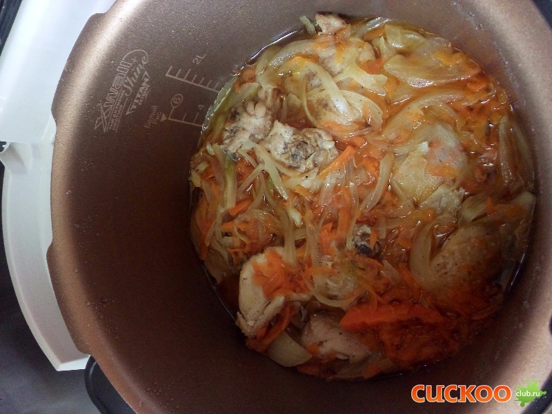 Бедра посолила, поперчила, чуть они у меня постояли и после я их обжарила с двух сторон, на программе поджарка 3 уровень 20 мин. Потом разложила купицу, лук, морковь и снова в таком же порядке и включила программу тушение, курочка готова, приятного аппетита