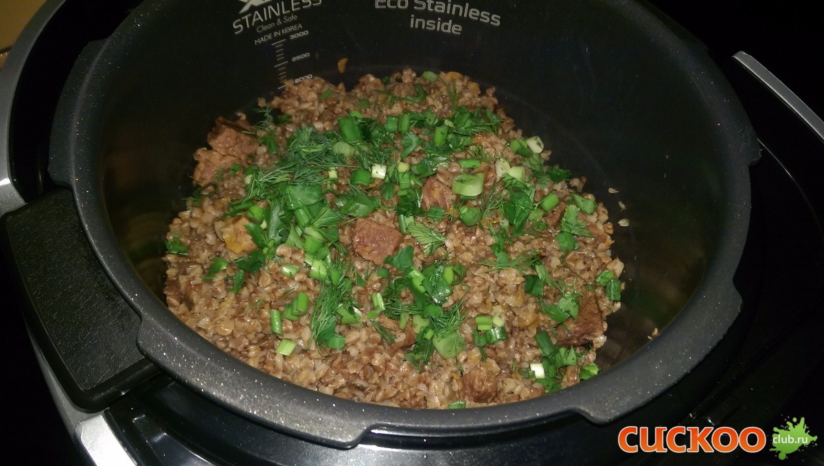 Мои дополнения: гречки всегда беру 2 м.ст, воды соответственно 6 м.ст. , т.к. в той пропорции, что предлагается по книге мяса ИМХО многовато.