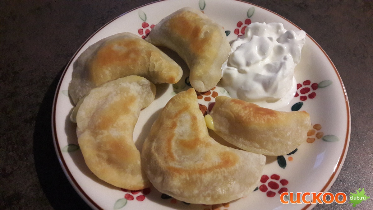 Сегодня лепила вареники с картошкой и грибами, завтра начинается пост. Лук, белые грибы обжарила 7 минут на оливковом масле в режиме поджарка уровень 3. Добавила к грибам нарезанный картофель, сушеную зелень, соль, выждала еще минуты 3. Дальше режим духовка 20 минут 1 уровень. Помяла , начинка готова. Тесто: соль, вода, мука, немного оливкового масла. Замесила в Кеше. Налепила вареников.Осталось немного теста, положила туда сыр, чтобы не готовить новую начинку и пожарила на пробу и с грибами- картошкой, и с сыром. Со сметанкой(сегодня еще можно) Вкуснооо. С картошкой-грибами оказались все-таки вкуснее. а17