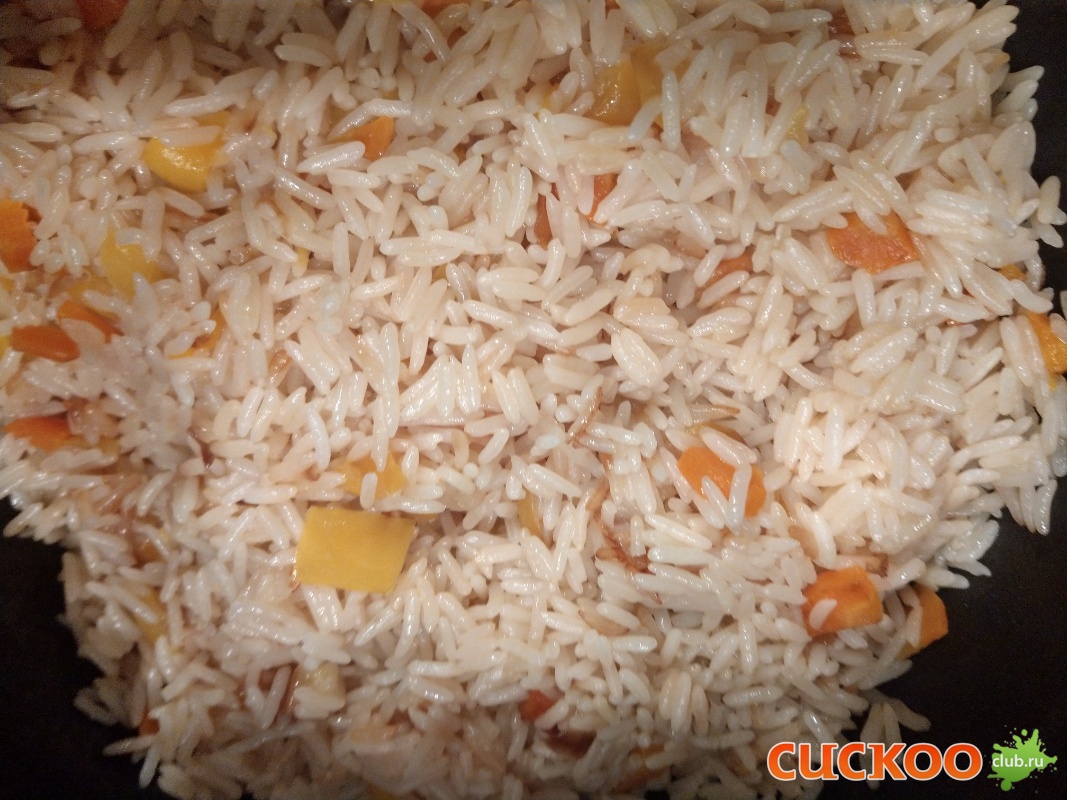 на режиме Поджарка 10 минут 3 уровень при открытой крышке обжарить овощи, добавить рис, воду, посолить, перемешать.