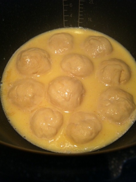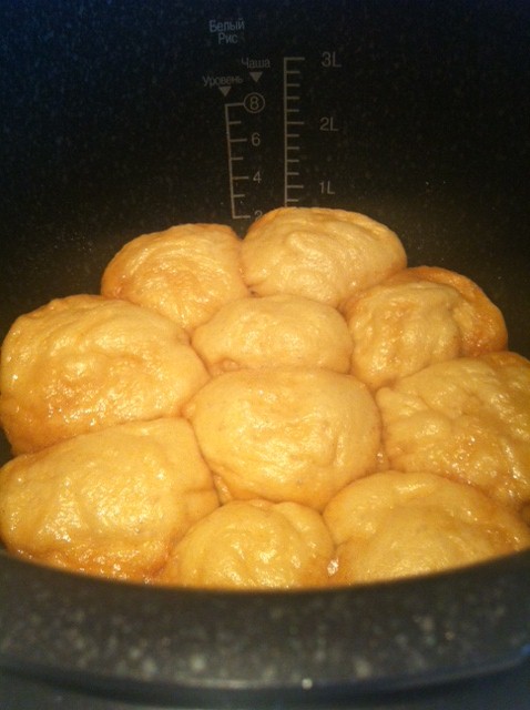 В теплом молоке растворить дрожжи, добавить сахар, яйцо, щепотку соли, постепенно добавить муку и замесить тесто. Оставить тесто подходить на 1 час в теплое место (у меня подходило в термосерверователе). Тесто должно увеличиться вдвое. Обминаем и разделяем на шарики, у меня получилось 10 штук. Оставить подходить минут на 15. Тем временем в микроволновке растопить кусочек сливочного масла и влить полстакана подогретого молока. Можно в молоко добавить сахара 3-5 ч.л. и ванильной эссенции по вкусу. Положить булочки в кукушечку, залить молочно-масляной смесью и выставить режим пароварка 25-30 минут, уровень 2 (долго думала каким режимом воспользоваться духовкой на первом уровне, мультиповаром или все таки пароваркой???). Решилась все-таки на режим пароварка. В течении 30 минут крышку не открывать, а потом можно посмотреть: верх у булочек при надавливании должен быть пружинистым, упругим. Закрыть крышкой (крышку вытереть от влаги, чтобы не капала на булочки), можно оставить до тех пор, пока булочки до остывания. Готовые булочки выложить на тарелку. Подавать с тем, что больше любите – с вареньем, сиропом, сгущенным какао или заварным кремом (мы кушали с бананово-шоколадной пастой, как-то мы их даже с чесночком употребляли, тоже очень вкусно, только тогда в молоко ненужно добавлять сахар и ваниль). Булочки очень хорошо пропекаются, низ даже чуть-чуть зажаристый. Нам ооочень понравилось...