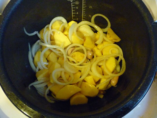 В чашу выкладываем не очищенный чеснок, картофель, далее выкладываем лук, солим и все перемешиваем.