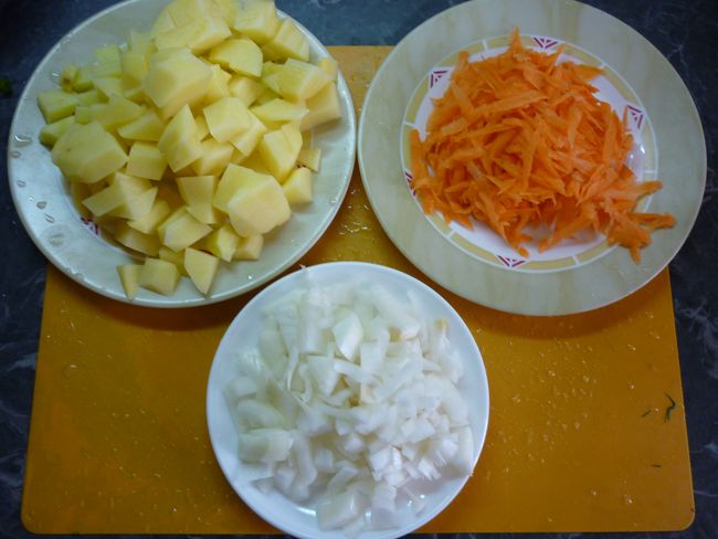Закрываем крышку, поворачиваем ручку в положение “Закрыто”. Выбираем программу “Мультиповар”. Устанавливаем время 40 минут и температуру 100 градусов. Нажимаем кнопку “Старт”. Пока готовится курица, нарезаем квадратиками картофель, трем морковь на крупной терке и нарезаем репчатый лук.