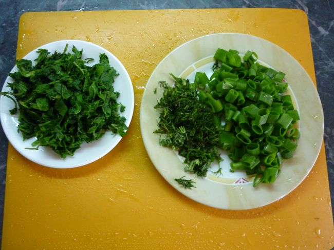Крапиву и сныть выкладываем в отдельную посуду, заливаем кипятком на 1-2 минуты и выкладываем в дуршлаг. Затем нарезаем. Зеленый лук и укроп, так же мелко режем.