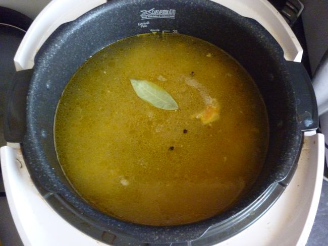 После сигнала, выкладываем картофель, курицу и заливаем бульоном, при необходимости добавляем воды до отметки 3 литра. Солим, добавляем лавровый лист, при желании перец горошком и две веточки гвоздики.