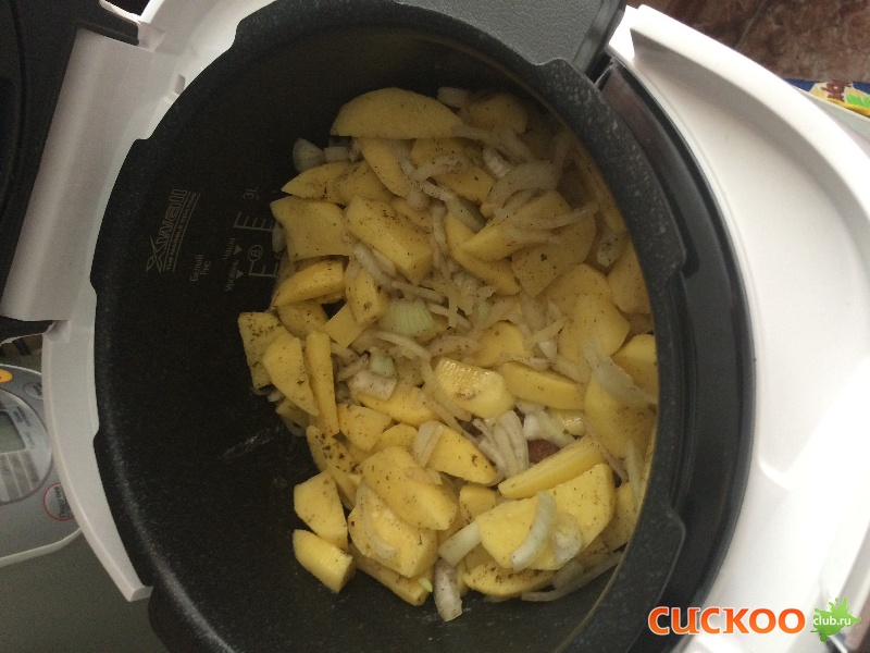 Фарш делала сама : свинина+говядина, соль,перец черный,лук,зубок чеснока,молоко чуток. Режим зажарка 10мин. Масло на дно чуток, затем перевернула котлеты(5 штук) сверху картошку с луком(посолить,перчить, ну и приправу можно ещё )снова зажарка10 мин. Затем Режим ТУШеное мясо до сигнала. Приятного аппетита !!!!