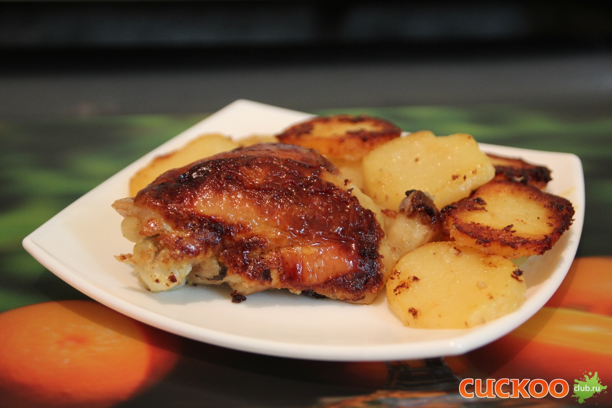 После окончания программы аккуратно выкладываем на тарелку бедра и высыпаем картошечку в миску. Затем сразу возвращаем бедра на дно мульти шкуркой вниз и сверху выкладываем картофель…еще 20 минут на духовке 2 уровень и мы получаем сочную картошечку и нежнейшую и поджаренную курочку.