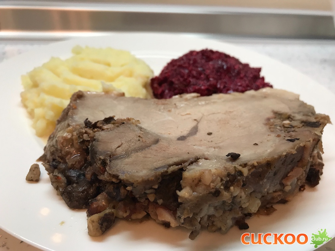 Забыла указать, что перед тем как заполнять разрезы, обтерла мясо солью и специями.
